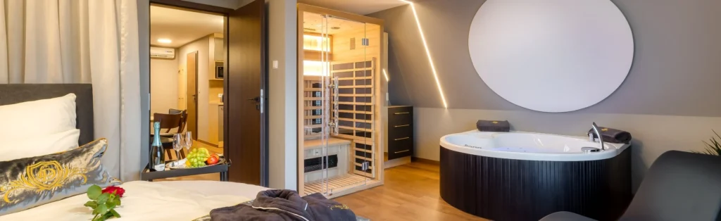 - Romantikus környezet: Baldachinos körágy, hangulatvilágítás, fényterápiás privát jacuzzi, és két személyes infraszauna, hogy a pihenés valóban különleges legyen.