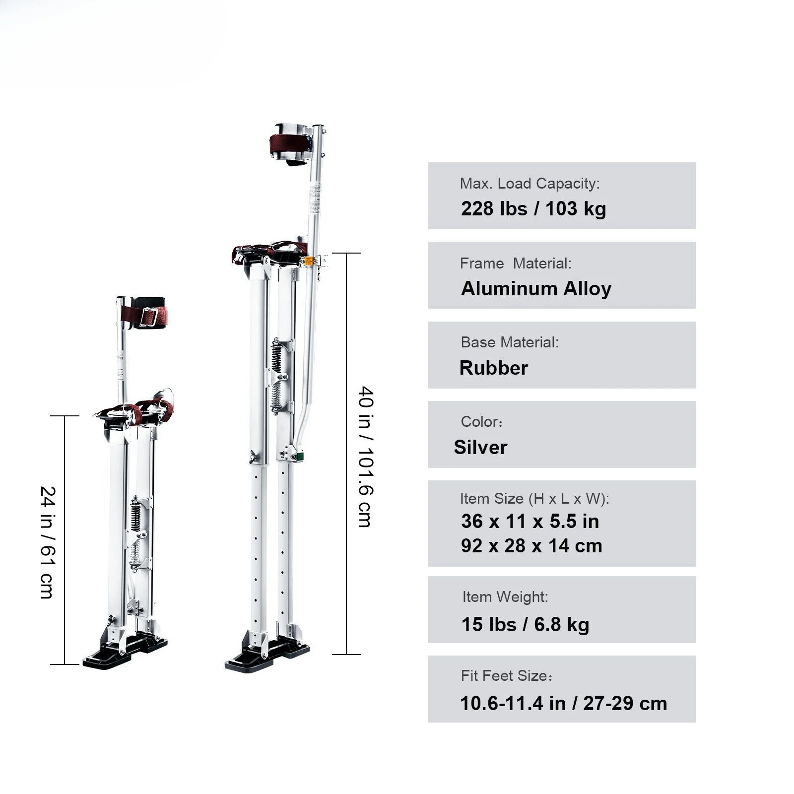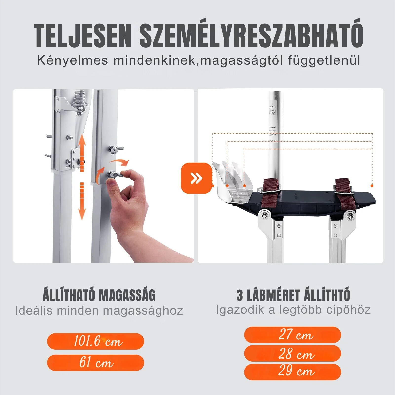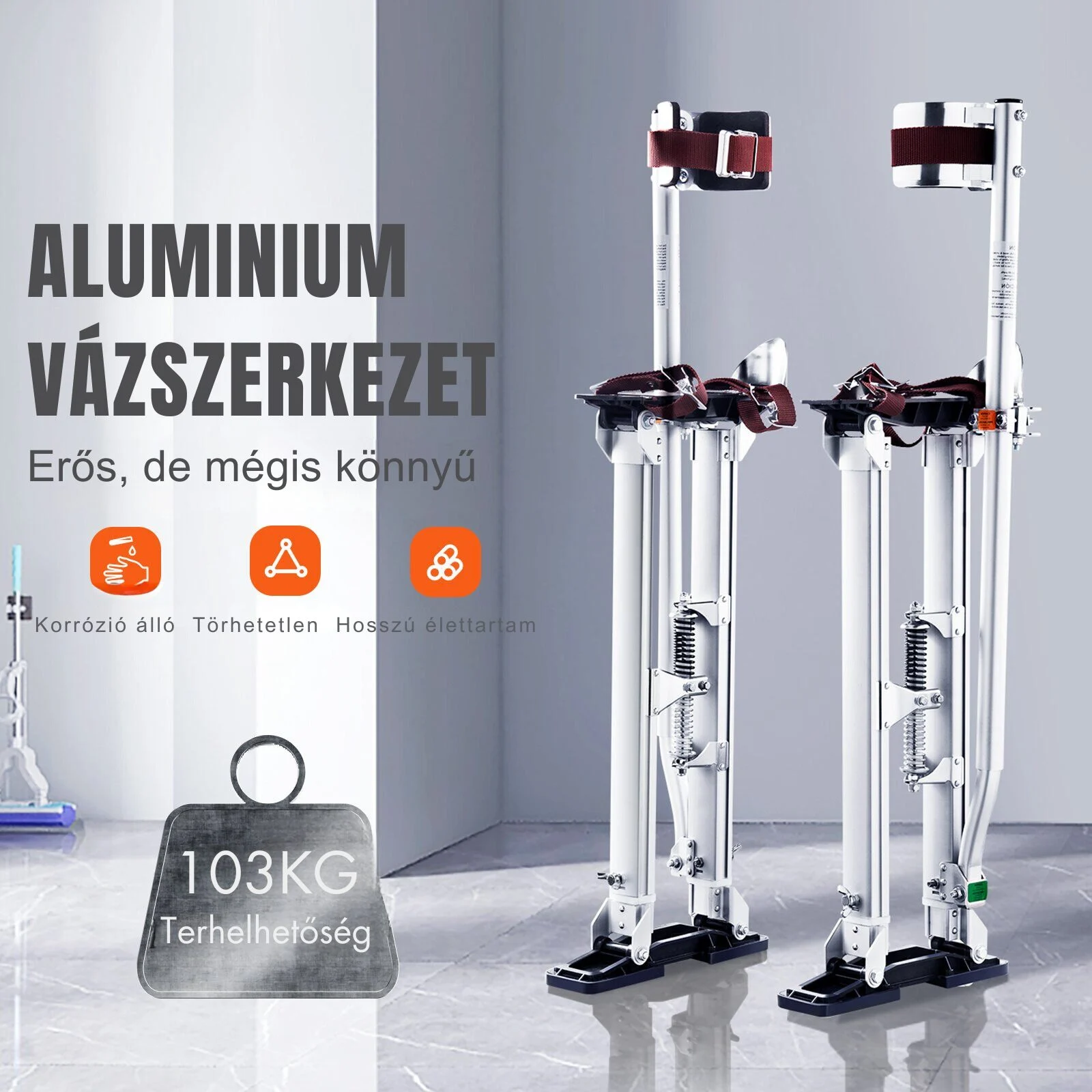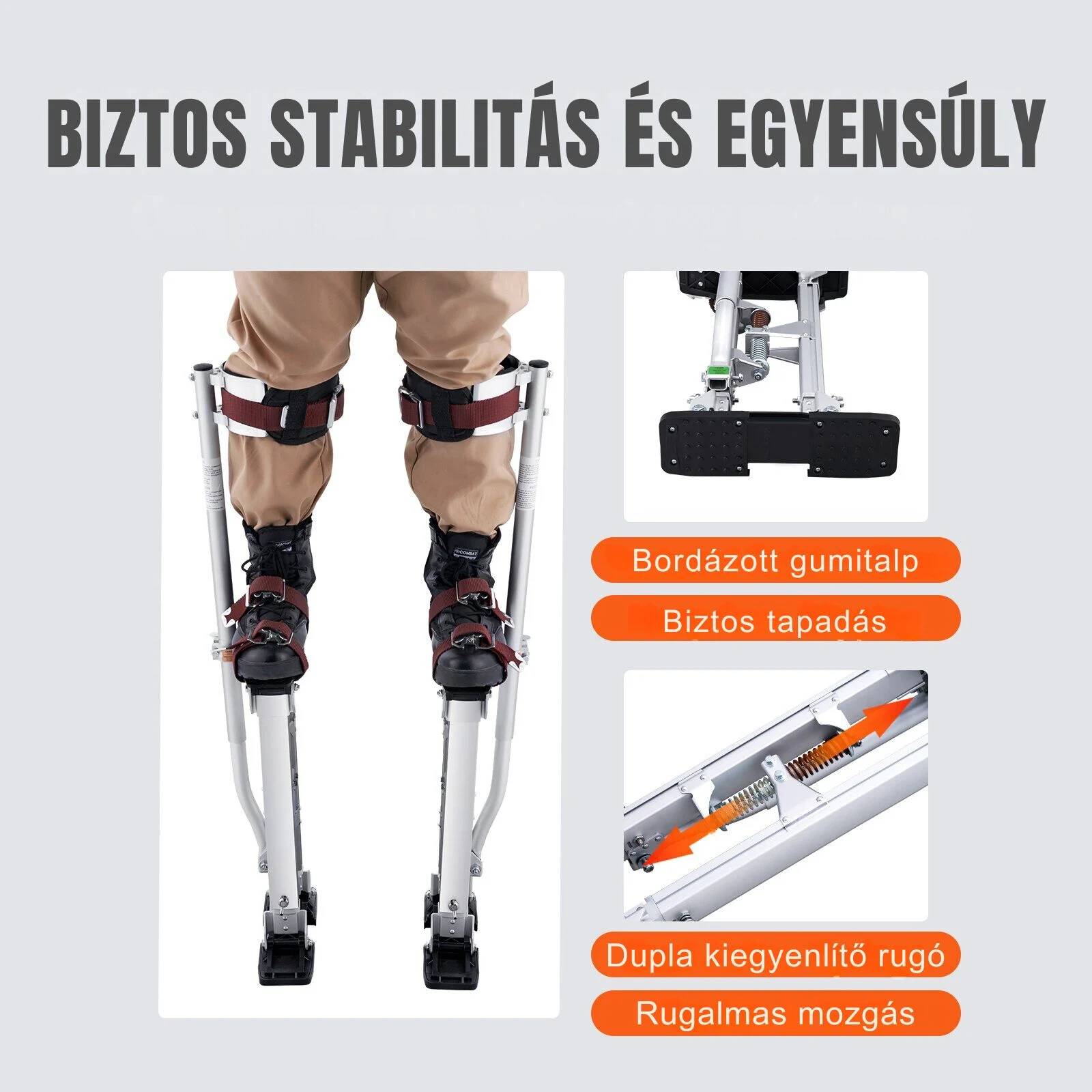 A gumi talpak a csúszás és a karcolások elleni védelmet nyújtják, elősegítve a zökkenőmentes és biztonságos munkavégzést. A kettős ütéscsillapító rugókkal és szilárd nylon hevederekkel ellátott gipszkarton gólyalábak kiemelkedő stabilitást biztosítanak. Ezek a funkciók segítenek az egyensúly megőrzésében és lehetővé teszik az önálló állást is.