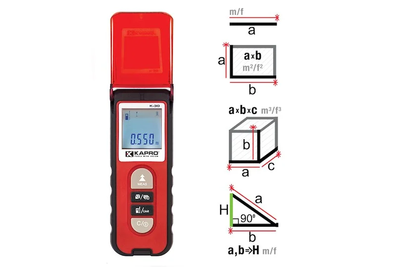 A Kapro lézeres távolságmérő akár 30 méteres távolságot mér, 2 mm/m pontossággal. Legyen szó terület-, térfogat-, vagy Pitagorasz-tétel alapú mérésekről, a Kapro minden feladattal megbirkózik. Mondj búcsút a találgatásnak – élvezd a pontos eredményeket, amelyek megkönnyítik a munkádat!