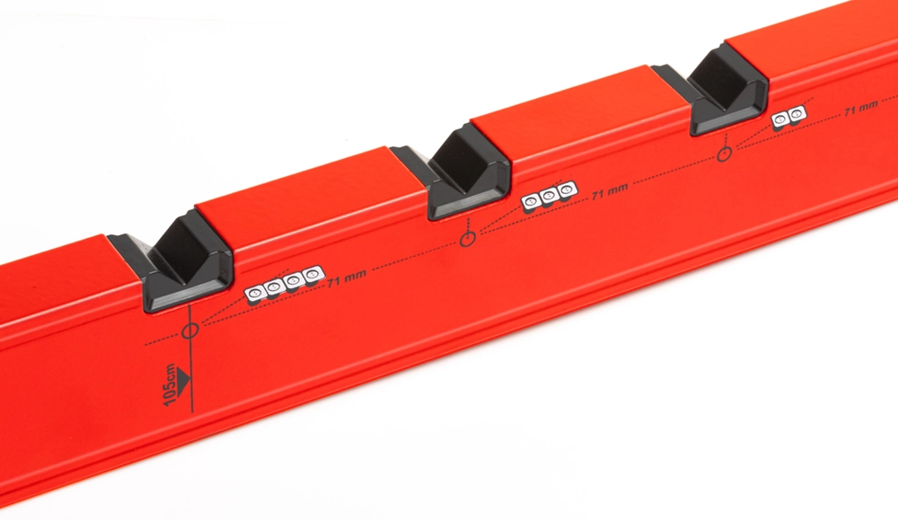 - Speciális Kialakítás: Az eszköz 71 mm-es távolságban mélyedésekkel rendelkezik, amelyek 4 rozetta befogadására alkalmasak. Továbbá többféle jelölést tartalmaz, amelyek megkönnyítik az elektromos aljzatok és kapcsolók pontos elhelyezését: