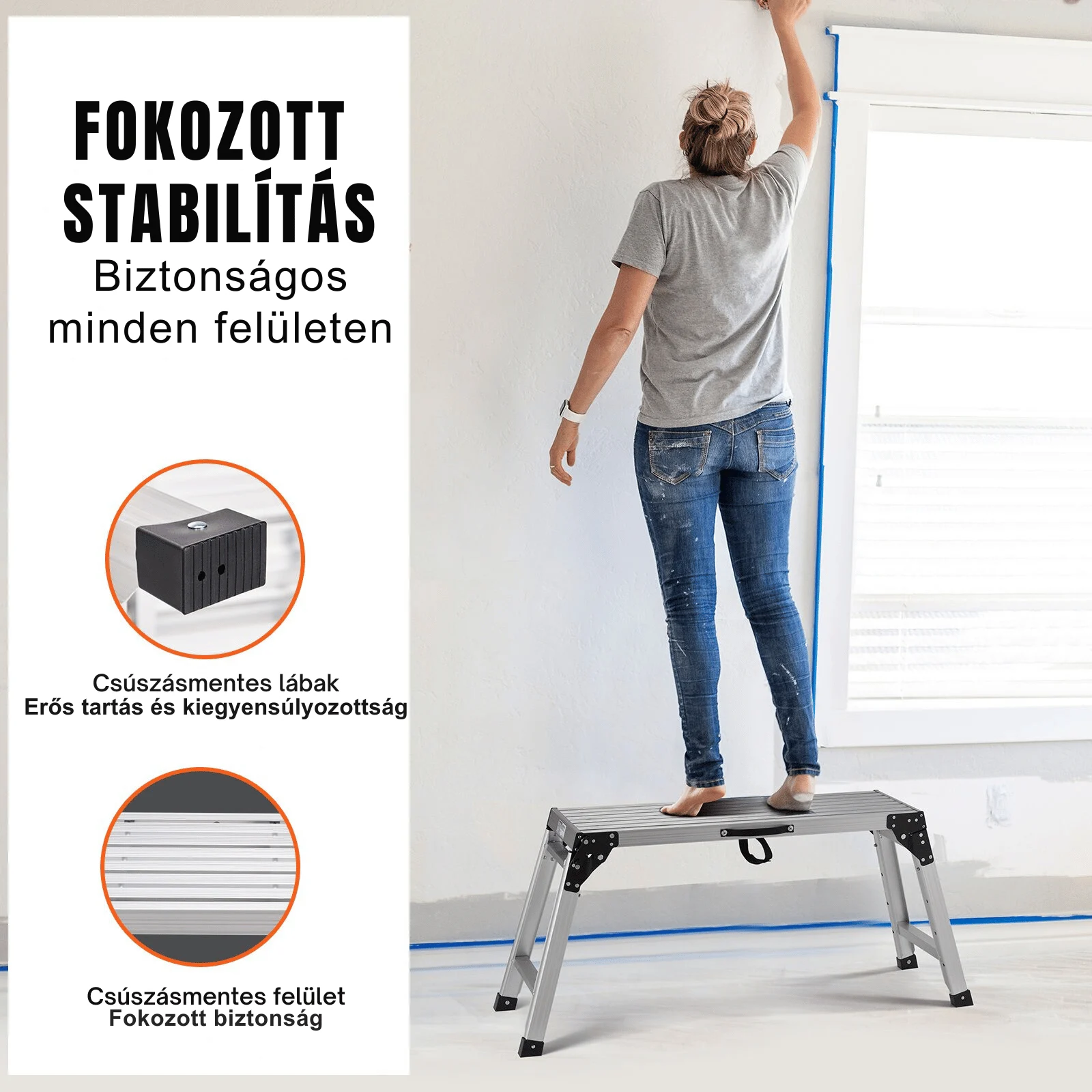 Platformunk felülete kiváló tapadást biztosít, csökkentve a megcsúszás és az esés kockázatát. Az állítható munkaállvány lehetővé teszi a nehezen elérhető helyekhez való hozzáférést, így nincs szükség létrákra vagy állványokra. Ideális beltéri és kültéri alkalmazások széles skálájához, beleértve az otthoni barkácsolást, a járműmosást, a magas helyek elérését és az általános karbantartási munkákat.