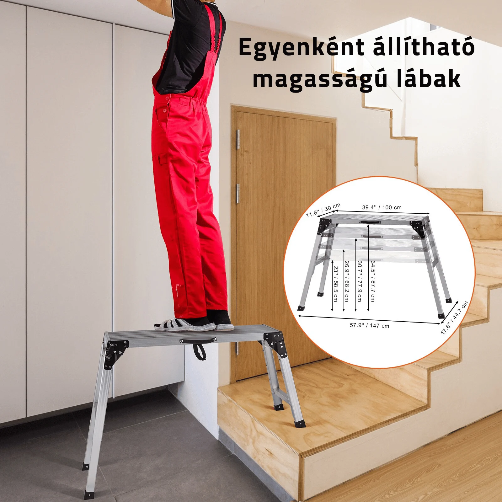 Nincs szükség összeszerelésre, így azonnal munkához láthat! A megerősített intelligens zár egyszerű összenyomásával könnyedén beállíthatja a magasságot négy különböző beállításra (58,5 / 68,2 / 77,9 / 87,7cm). Ez a funkció lehetővé teszi, hogy könnyedén hozzáférjen minden sarkhoz, mennyezethez és hasadékhoz. A gipszkarton zsámolylétra lépcsőn is használható, így a legnehezebben elérhető helyek sem jelentenek akadályt többé.