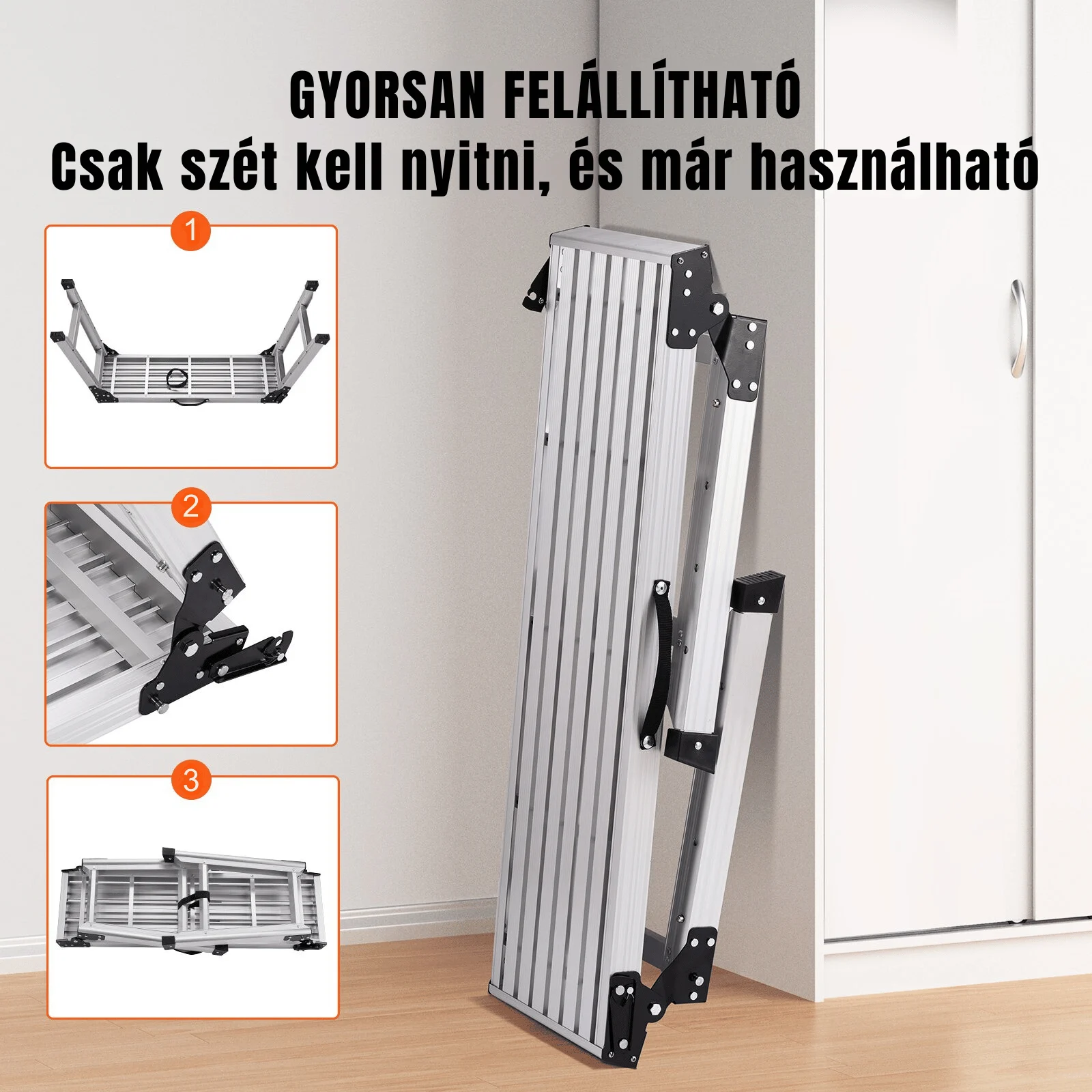 Lépcsőpadunk könnyen összecsukható, így kényelmesen tárolható és szállítható. Néhány másodperc alatt összecsukhatja vagy széthajthatja a platformot, így időt és erőfeszítést takaríthat meg, hogy a feladatok hatékony elvégzésére összpontosíthasson.